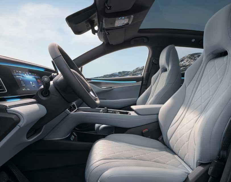 BYD Sealion 7 menghadirkan kenyamanan maksimal dengan kursi depan berventilasi dan berpemanas, kursi belakang berpemanas, serta kursi pengemudi elektrik yang dilengkapi dukungan punggung dan kaki.