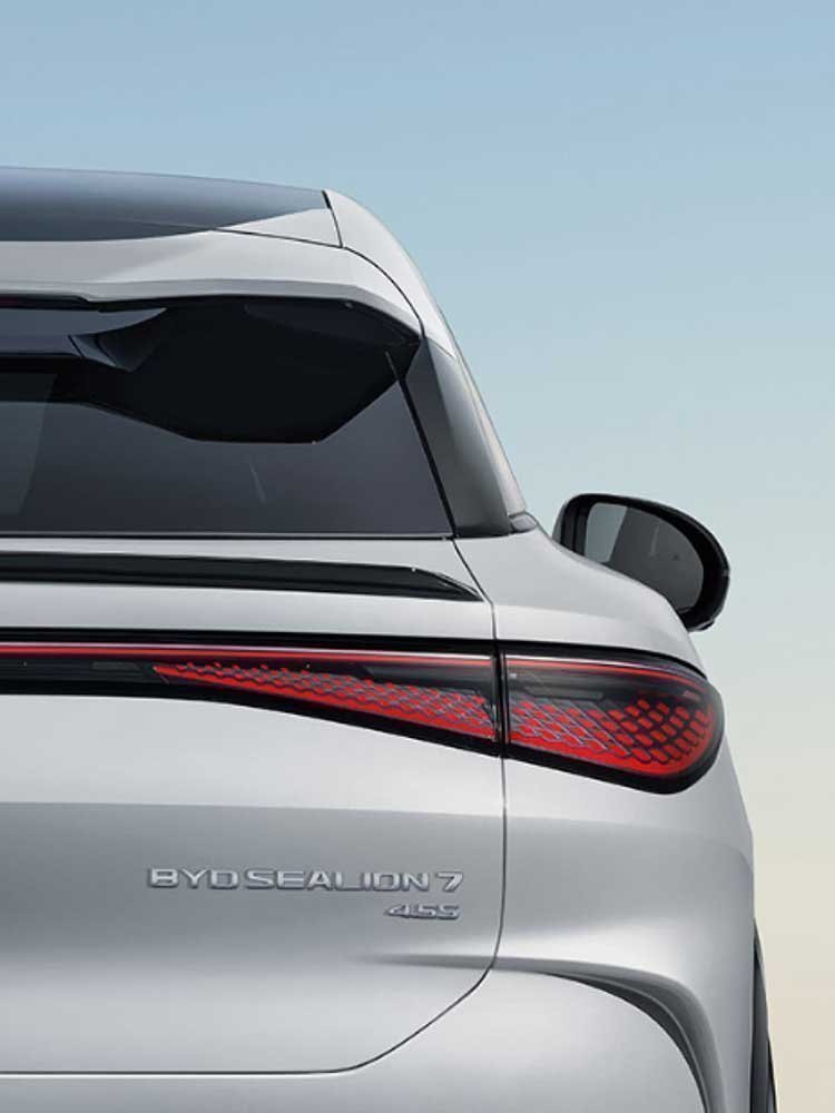 Lampu belakang futuristis BYD Sealion 7 memadukan garis cahaya ramping dengan detail tetesan air, menghadirkan efek dinamis terinspirasi gerakan air yang cepat, sehingga tampil modern, elegan, dan mencuri perhatian di jalan.